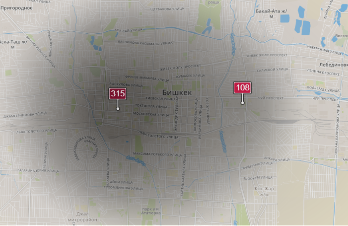 - в районе улиц Московской/Уметалиева. Уровень загрязнения превышен в 6,54 раза: PM2.5 среднесуточный — 229 мкг/м³, на момент измерения — 315 мкг/м³;