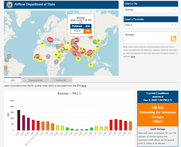 Посольство США в Кыргызстане также установило датчик. Он показывает индекс качества воздуха в режиме онлайн. Информация обновляется ежечасно.