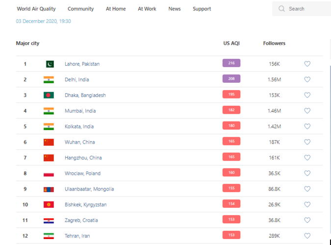 В рейтинге крупнейших городов мира по качеству воздуха World Air Quality на 19.30 Бишкек поднялся на 10-е место.