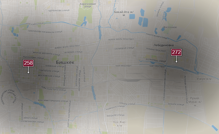 - в микрорайоне «Аламедин-1» уровень загрязнения превышен в 5,25 раза: PM2.5 среднесуточный — 184 мкг/м³, на момент измерения — 272 мкг/м³.