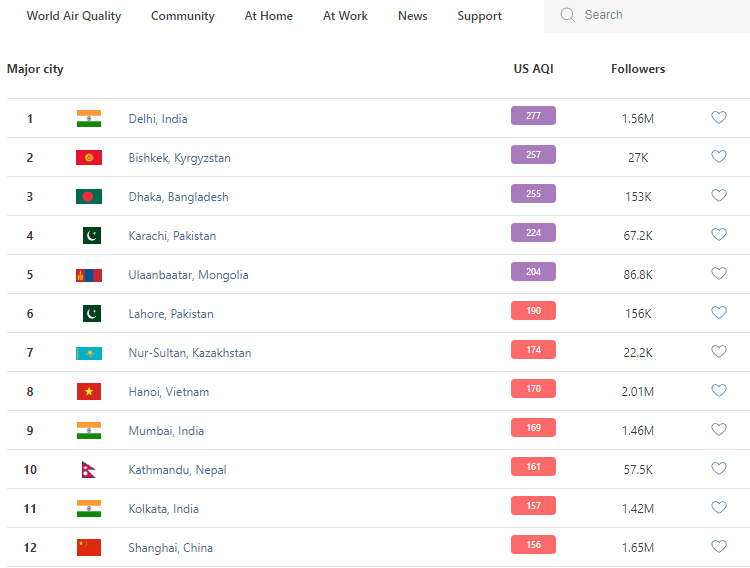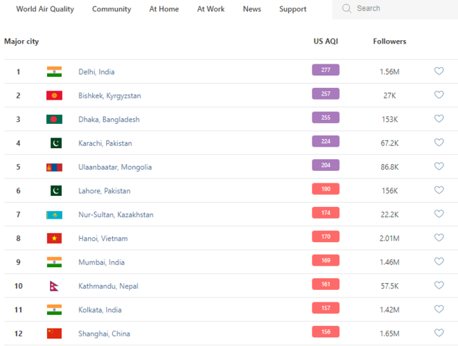 В рейтинге крупнейших городов мира по качеству воздуха World Air Quality на 19.30 Бишкек поднялся на 2-е место.