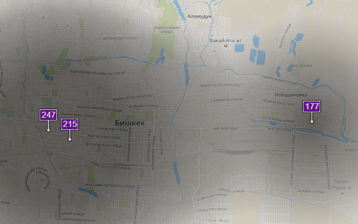 - в районе улиц Бейшеналиевой/Токтогула. Уровень загрязнения превышен в 3,31 раза: PM2.5 среднесуточный — 116 мкг/м³, на момент измерения — 247 мкг/м³;