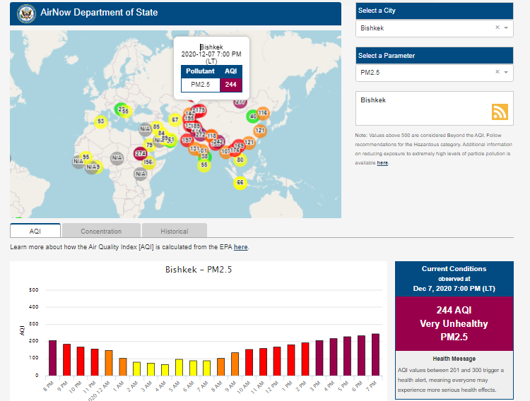 Посольство США в Кыргызстане также установило датчик. Он показывает индекс качества воздуха в режиме онлайн. Информация обновляется ежечасно.