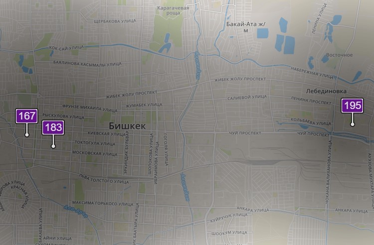 - в районе улиц Бейшеналиевой/Токтогула. Уровень загрязнения превышен в 3,85 раза: PM2.5 среднесуточный — 135 мкг/м³, на момент измерения — 167 мкг/м³;
