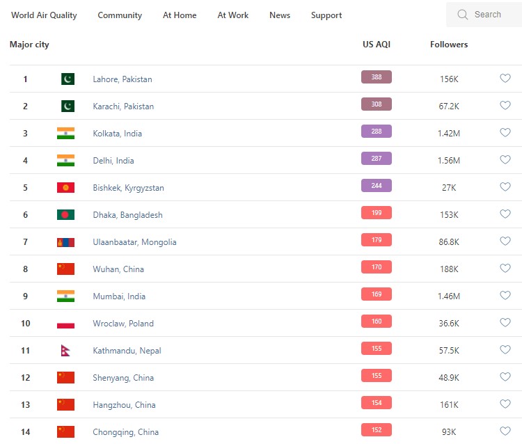 В рейтинге крупнейших городов мира по качеству воздуха World Air Quality на 8.30 Бишкек поднялся на 2-е место.