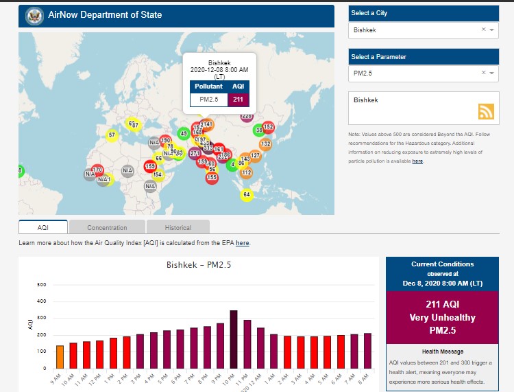 Посольство США в Кыргызстане также установило датчик. Он показывает индекс качества воздуха в режиме онлайн. Информация обновляется ежечасно.