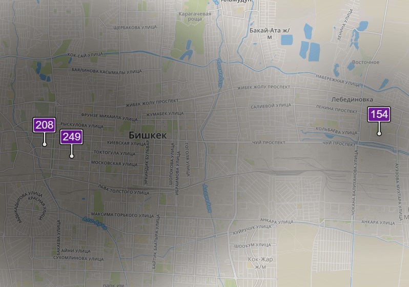 - в районе улиц Бейшеналиевой/Токтогула. Уровень загрязнения превышен в 6,31 раза: PM2.5 среднесуточный — 221 мкг/м³, на момент измерения — 208 мкг/м³;