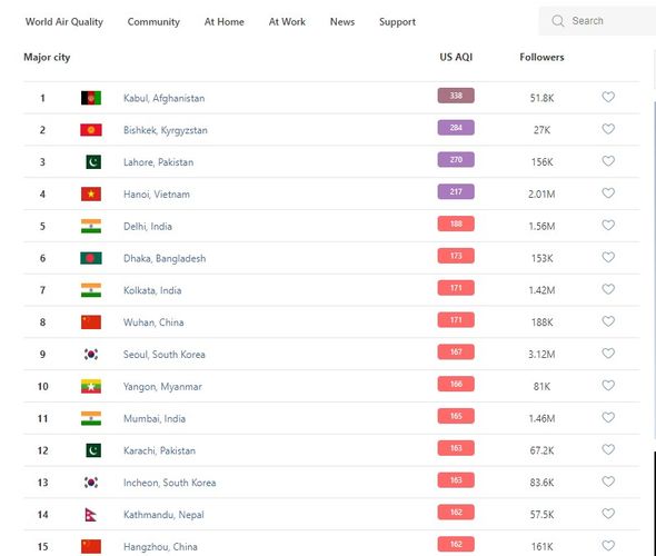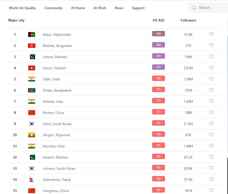 В рейтинге крупнейших городов мира по качеству воздуха World Air Quality на 8.30 Бишкек поднялся на 2-е место.