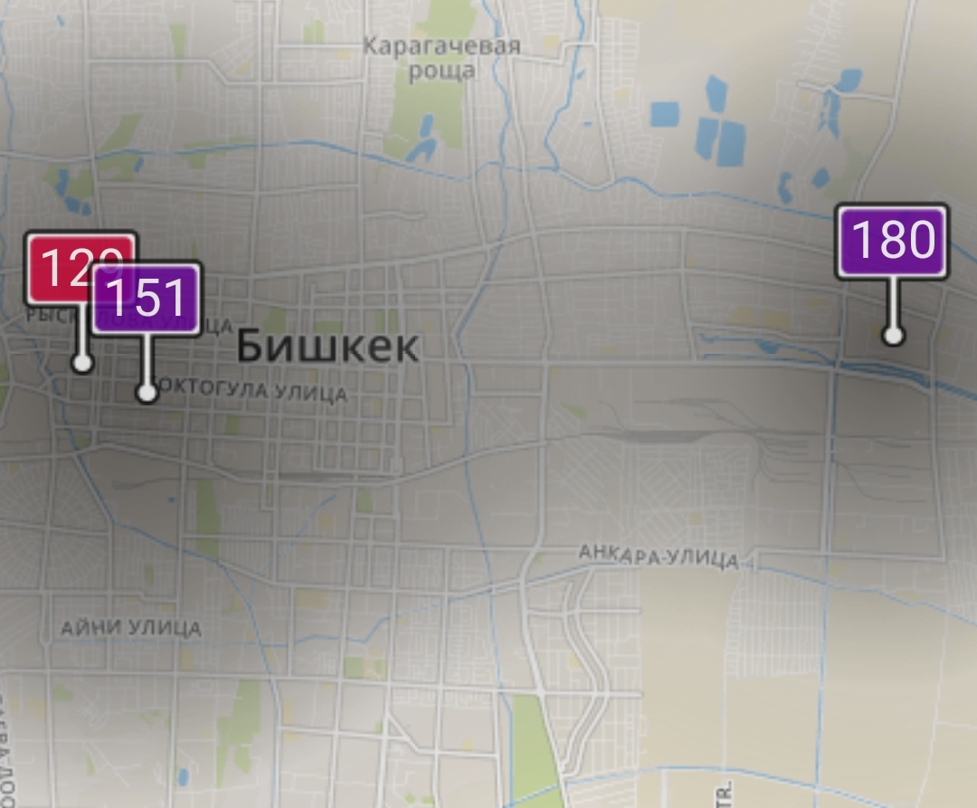 - в районе улиц Бейшеналиевой/Токтогула. Уровень загрязнения превышен в 3,94 раза: PM2.5 среднесуточный — 138 мкг/м³, на момент измерения — 129 мкг/м³;