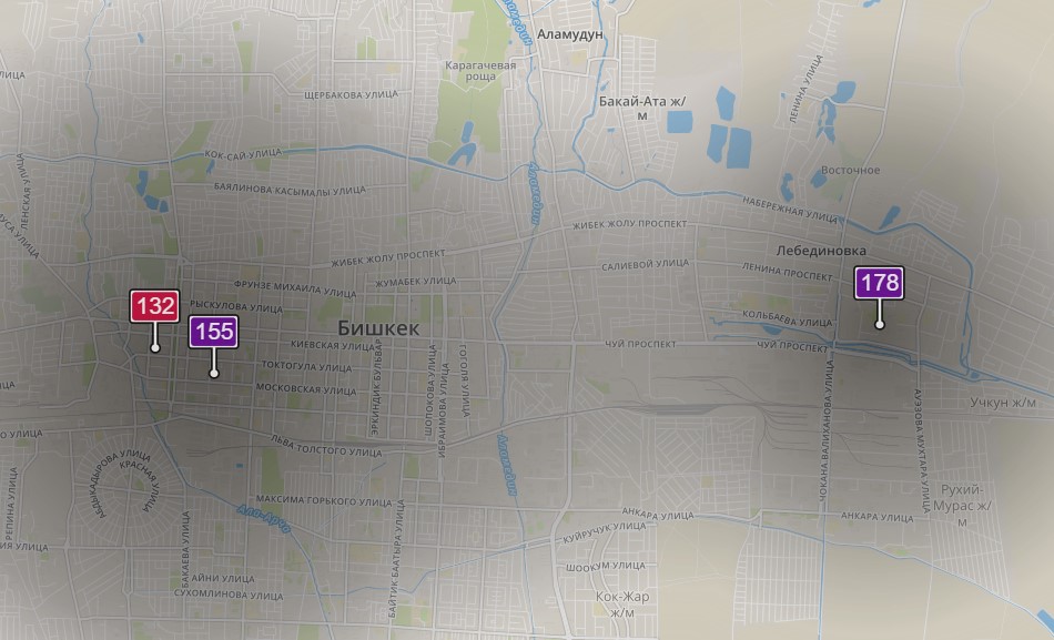 - в районе улиц Бейшеналиевой/Токтогула. Уровень загрязнения превышен в 4,31 раза: PM2.5 среднесуточный — 151 мкг/м³, на момент измерения — 132 мкг/м³;