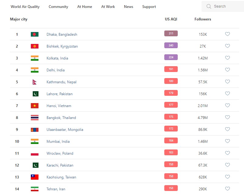 В рейтинге крупнейших городов мира по качеству воздуха World Air Quality Бишкек на 8.30 опустился на второе место.