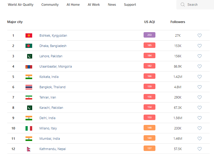В рейтинге крупнейших городов мира по качеству воздуха World Air Quality Бишкек на 19.30 находится на первом месте.