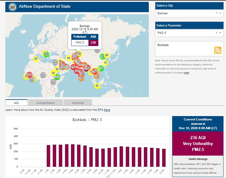 Посольство США в Кыргызстане также установило датчик. Он показывает индекс качества воздуха в режиме онлайн. Информация обновляется ежечасно.