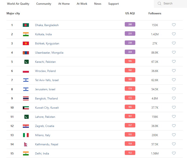 В рейтинге крупнейших городов мира по качеству воздуха World Air Quality Бишкек на 8.30 спустился на третье место.