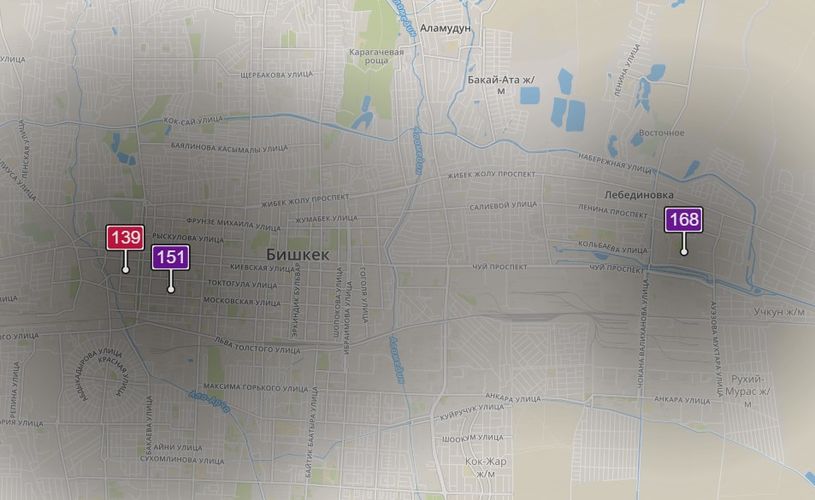 - в районе улиц Бейшеналиевой/Токтогула. Уровень загрязнения превышен в 4,11 раза: PM2.5 среднесуточный — 144 мкг/м³, на момент измерения — 139 мкг/м³;