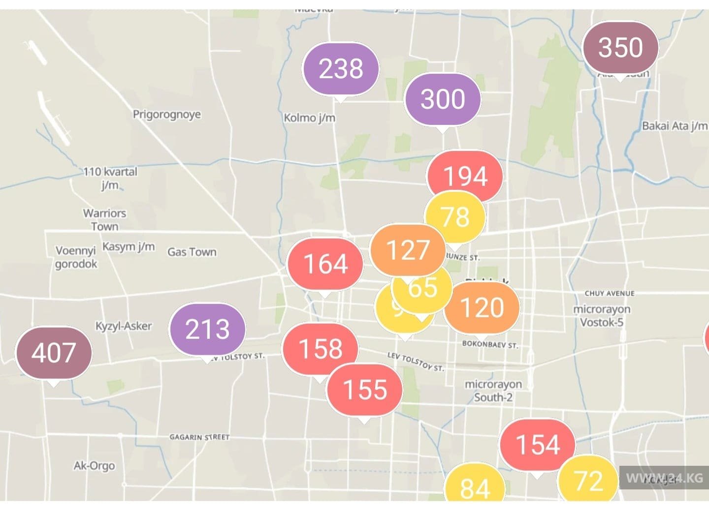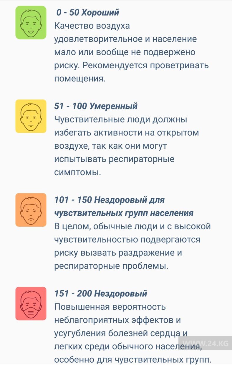 Бишкек не сходит с лидирующих позиций в рейтинге крупнейших городов мира по качеству воздуха. Показатели рекордно повышаются, когда вечером люди начинают топить свои печки. В таких случаях показатели в новостройках города превышают 1 тысячи AQI (индекс качества воздуха), тогда как воздух с показателем от 300 до 500 считается опасным для здоровья.