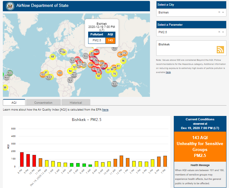 Посольство США в Кыргызстане также установило датчик. Он показывает индекс качества воздуха в режиме онлайн. Информация обновляется ежечасно.