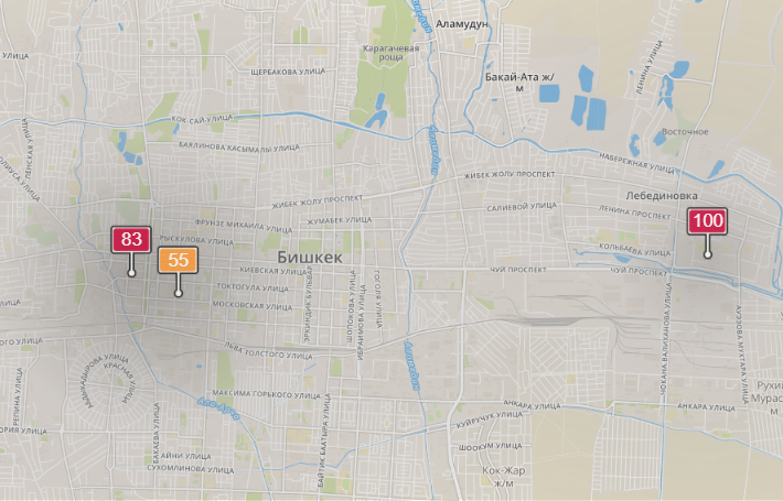- в районе улиц Бейшеналиевой/Токтогула. Уровень загрязнения превышен в 2,17 раза: PM2.5 среднесуточный — 76 мкг/м³, на момент измерения — 83 мкг/м³;