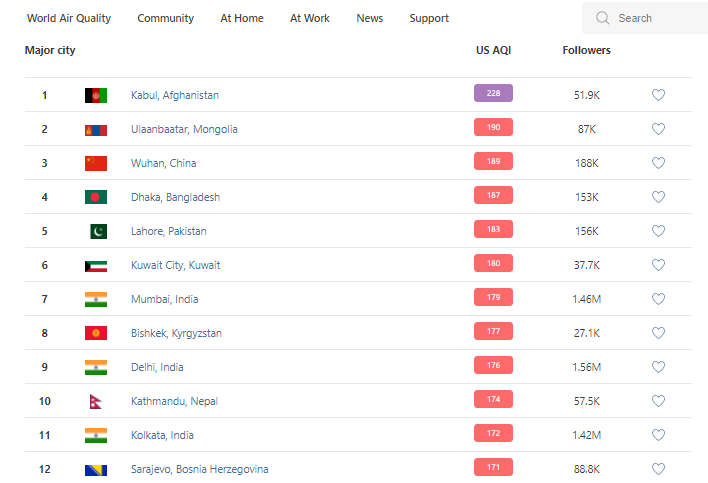 В рейтинге крупнейших городов мира по качеству воздуха World Air Quality Бишкек на 19.30 поднялся на 8-е место.