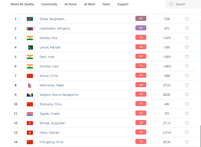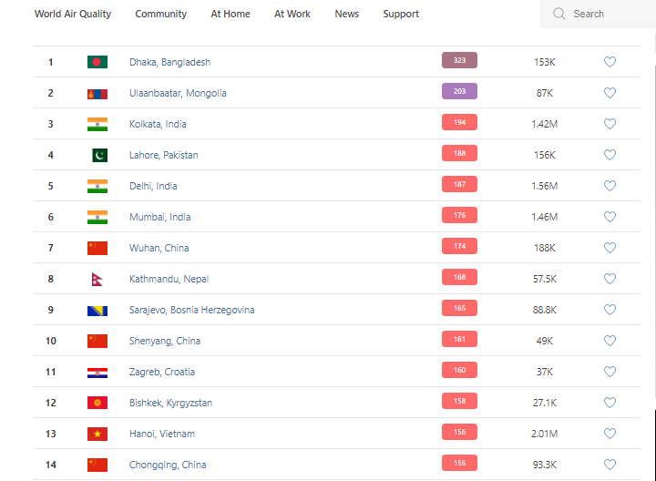 В рейтинге крупнейших городов мира по качеству воздуха World Air Quality Бишкек на 19.30 поднялся на 12-е место.