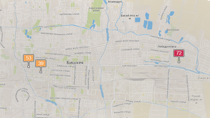 - в районе улиц Бейшеналиевой/Токтогула. Уровень загрязнения превышен в 2,25 раза: PM2.5 среднесуточный — 79 мкг/м³, на момент измерения — 53 мкг/м³;