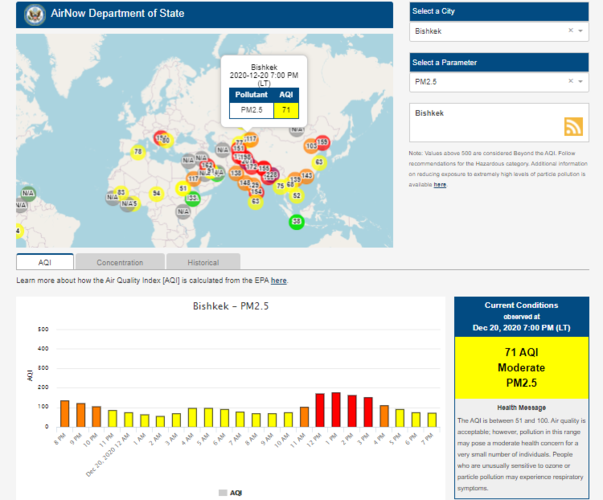Посольство США в Кыргызстане также установило датчик. Он показывает индекс качества воздуха в режиме онлайн. Информация обновляется ежечасно.