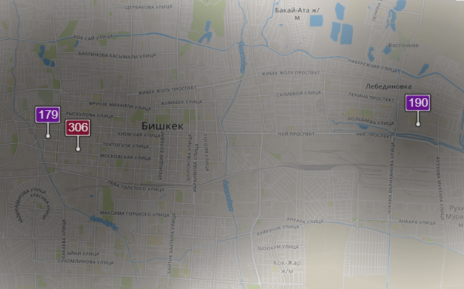 - в районе улиц Бейшеналиевой/Токтогула. Уровень загрязнения превышен в 1,85 раза: PM2.5 среднесуточный — 65 мкг/м³, на момент измерения — 179 мкг/м³;