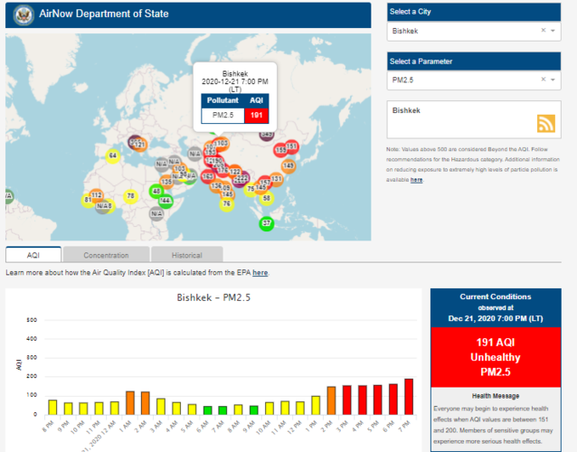 Посольство США в Кыргызстане также установило датчик. Он показывает индекс качества воздуха в режиме онлайн. Информация обновляется ежечасно.