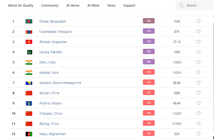 В рейтинге крупнейших городов мира по качеству воздуха World Air Quality Бишкек на 19.30 поднялся на третье место.