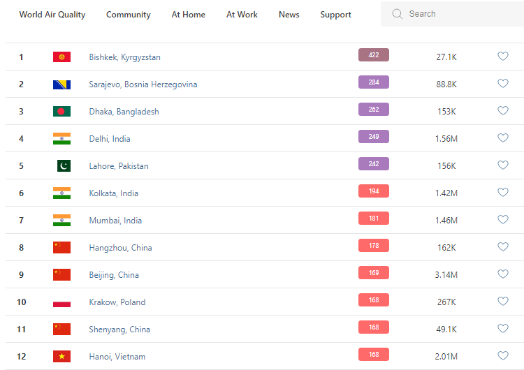 В рейтинге крупнейших городов мира по качеству воздуха World Air Quality Бишкек на 19.30 поднялся на первое место.
