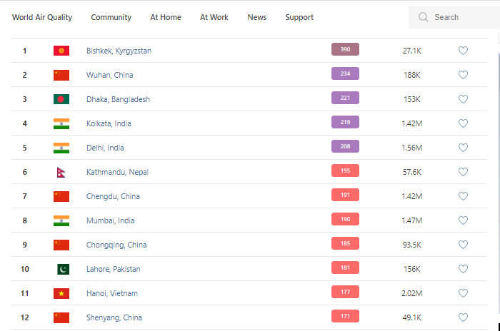 В рейтинге крупнейших городов мира по качеству воздуха World Air Quality Бишкек на 9.30 находится на первом месте.