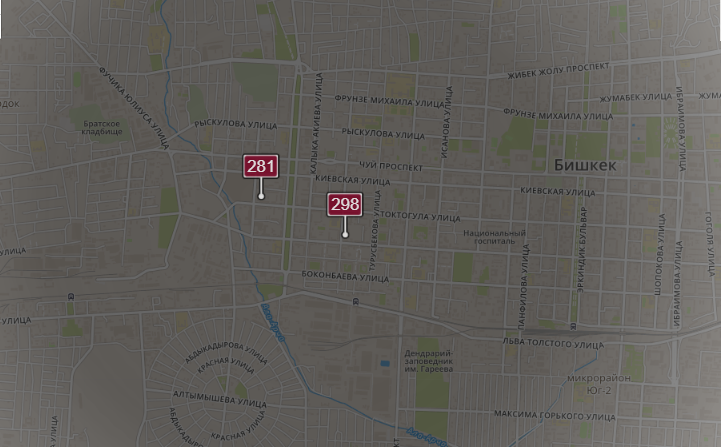 - в районе улиц Бейшеналиевой/Токтогула Уровень загрязнения превышен в 7,88 раза: PM2.5 среднесуточный — 276 мкг/м³, на момент измерения — 281 мкг/м³;