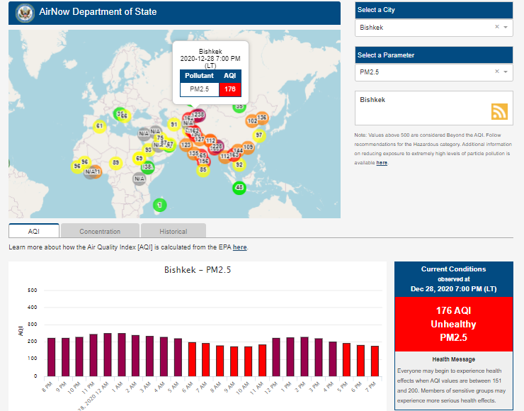 Посольство США в Кыргызстане также установило датчик. Он показывает индекс качества воздуха в режиме онлайн. Информация обновляется ежечасно.