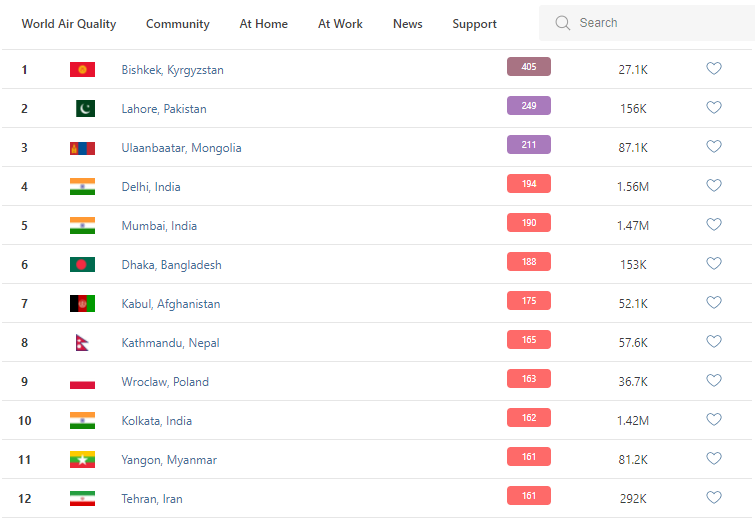 В рейтинге крупнейших городов мира по качеству воздуха World Air Quality Бишкек находится на первом месте.