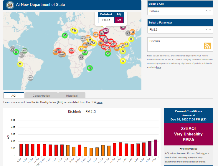 В 19.30 статус города отмечен как «очень нездоровый» (Very Unhealthy). Индекс качества воздуха, по данным сайта, составляет 405 (AQI).