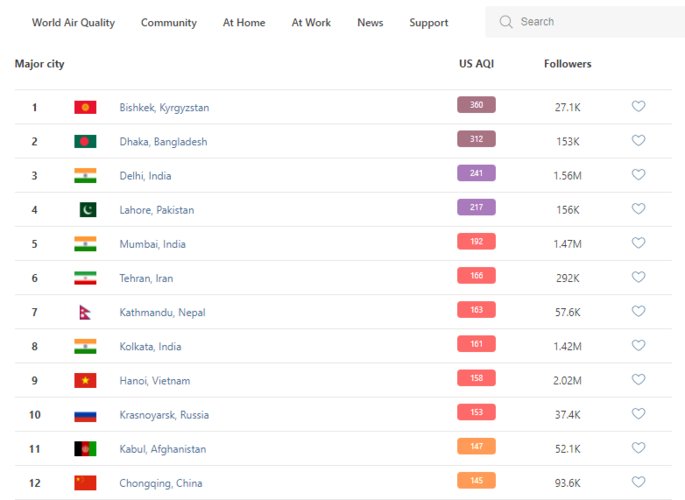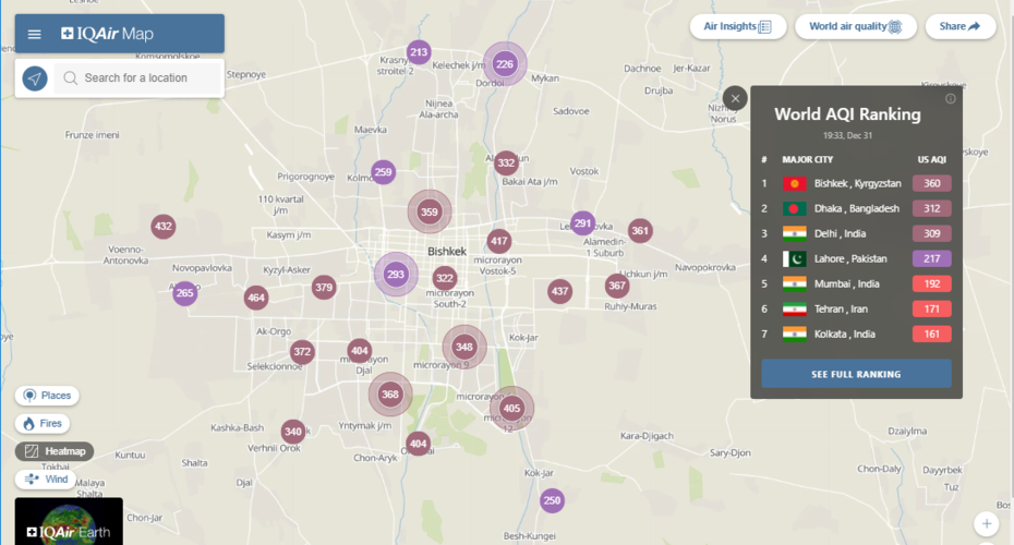 В рейтинге крупнейших городов мира по качеству воздуха World Air Quality Бишкек находится на первом месте.