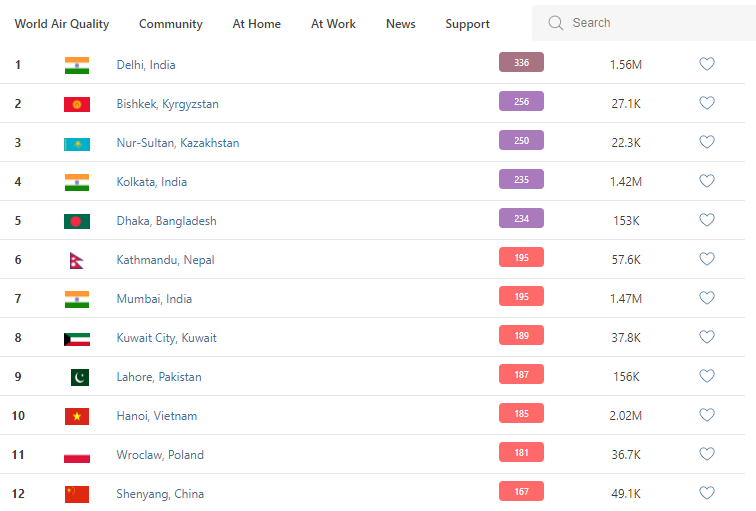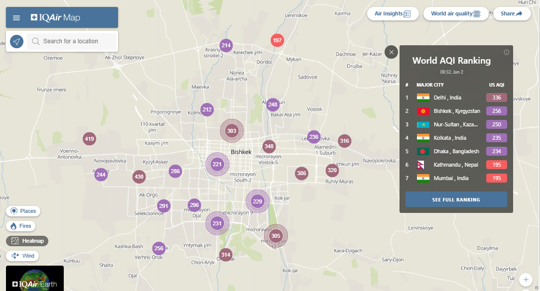 В рейтинге крупнейших городов мира по качеству воздуха World Air Quality Бишкек находится на втором месте.