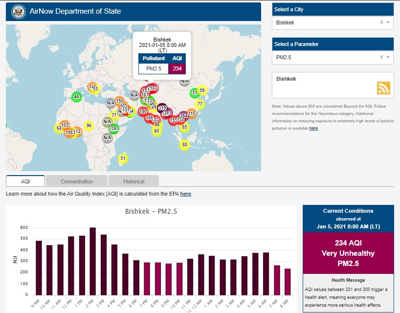 Информация обновляется каждый час. На 8.00 индекс качества воздуха в районе дипломатической миссии — 234 (AQI).