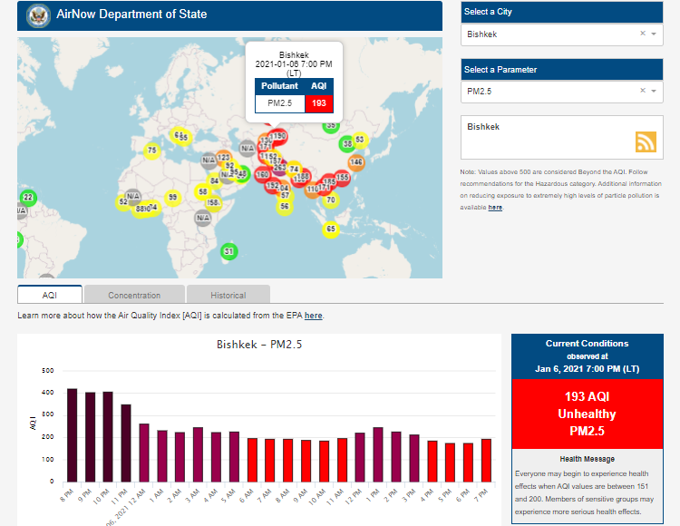 Информация обновляется каждый час. На 19.00 индекс качества воздуха в районе дипломатической миссии — 193 (AQI).
