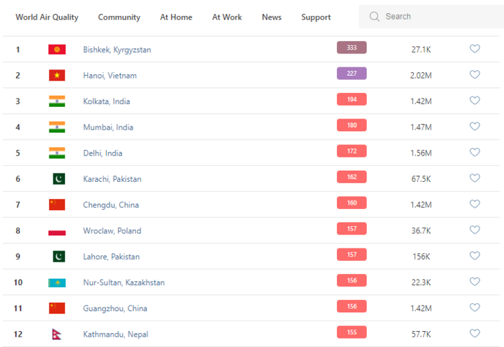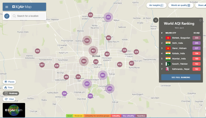 В рейтинге крупнейших городов мира по качеству воздуха World Air Quality Бишкек опять находится на первом месте.