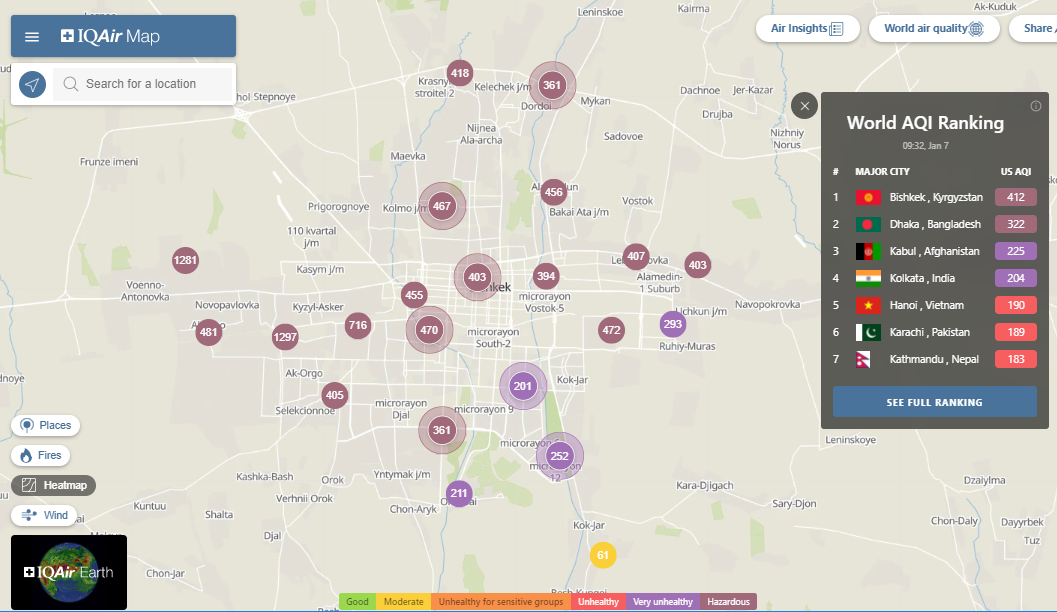 В рейтинге крупнейших городов мира по качеству воздуха World Air Quality Бишкек находится на первом месте.