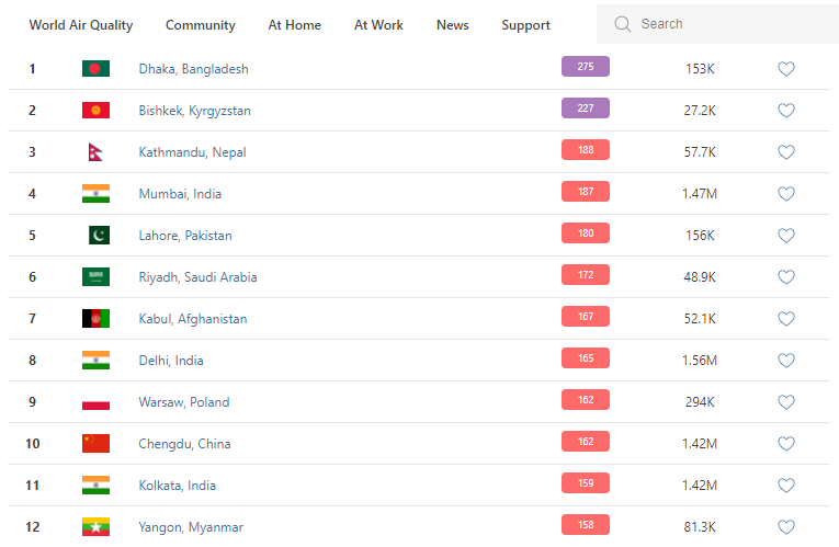 В рейтинге крупнейших городов мира по качеству воздуха World Air Quality Бишкек находится на втором месте.