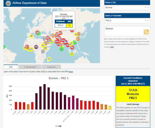 Информация обновляется каждый час. На 9.00 индекс качества воздуха в районе дипломатической миссии — 72 (AQI).