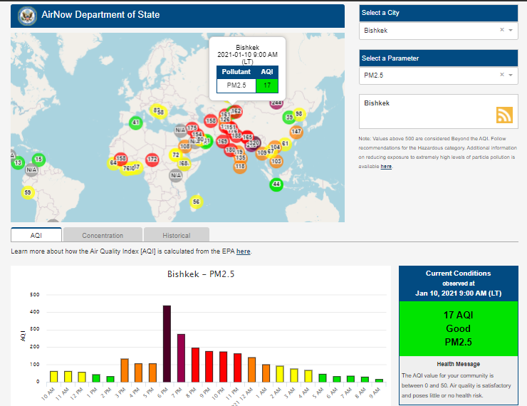 Информация обновляется каждый час. На 9.00 индекс качества воздуха в районе дипломатической миссии — 17 (AQI).