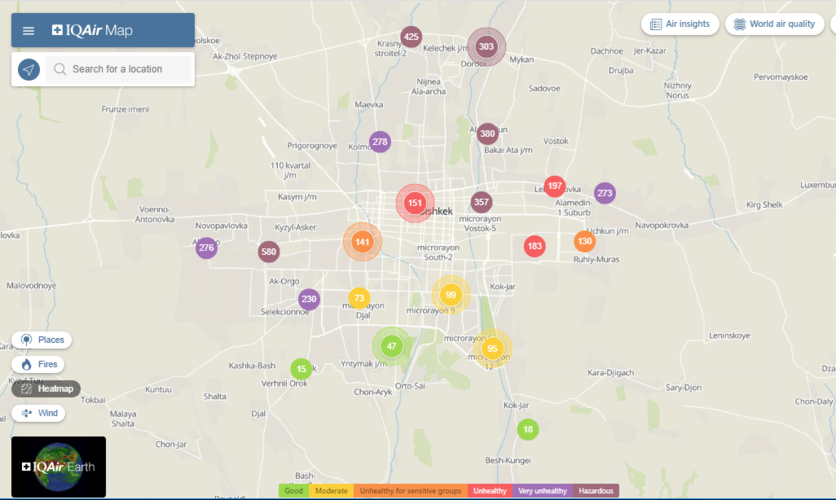 Общественный фонд «Институт экологических решений» установил датчики в столице и пригороде. На карте можно увидеть среднее значение AQI в разных районах Бишкека. Его обновляют ежечасно.