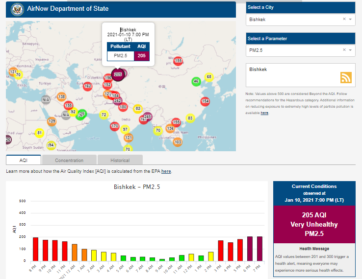 Информация обновляется каждый час. На 19.00 индекс качества воздуха в районе дипломатической миссии — 205 (AQI).
