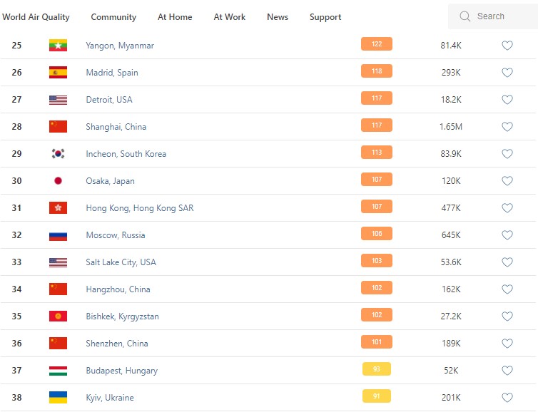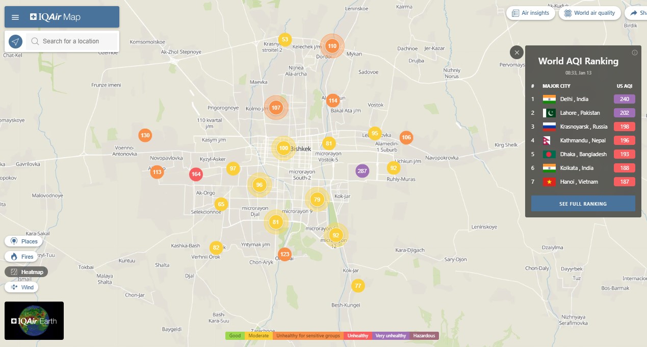 В рейтинге крупнейших городов мира по качеству воздуха World Air Quality Бишкек опустился на 35-е место.