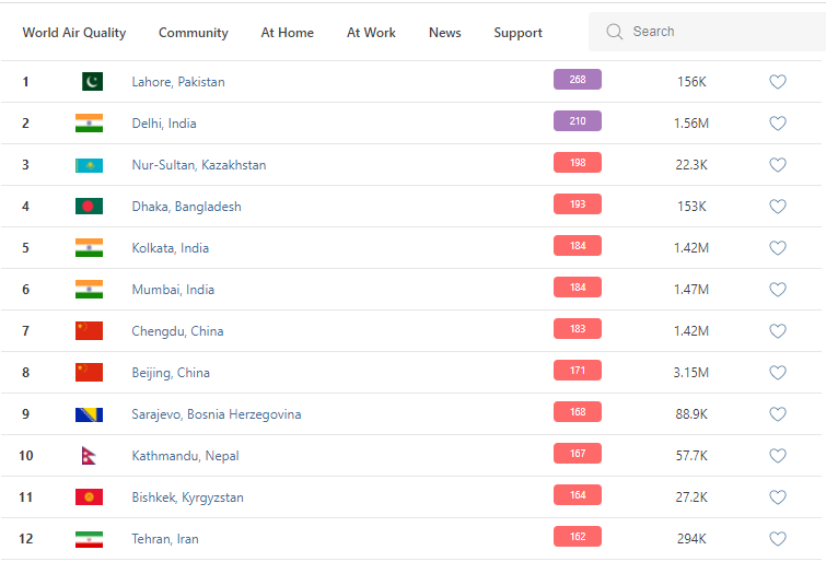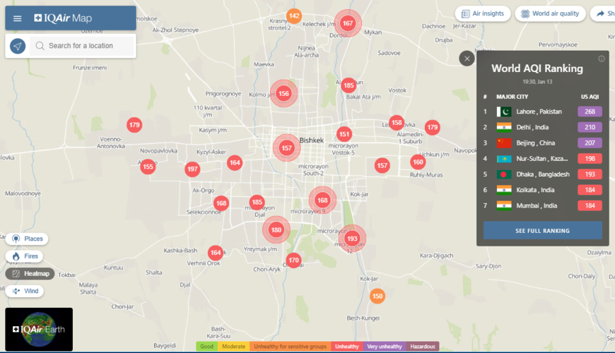 В рейтинге крупнейших городов мира по качеству воздуха World Air Quality Бишкек поднялся на 11-е место.