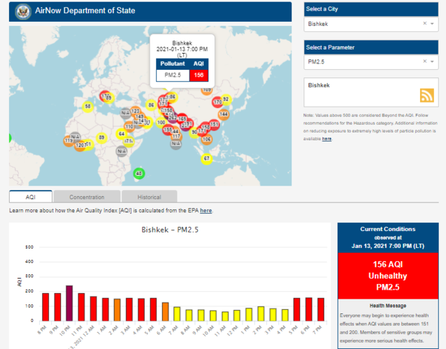 Информация обновляется каждый час. На 19.00 индекс качества воздуха в районе дипломатической миссии — 156 (AQI).