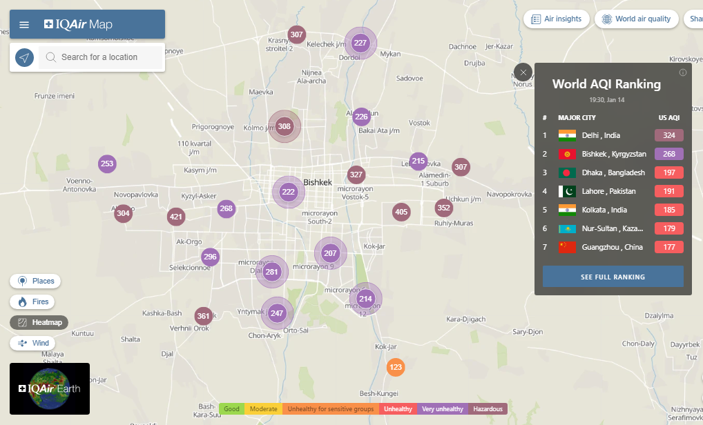 В рейтинге крупнейших городов мира по качеству воздуха World Air Quality Бишкек поднялся на второе место.